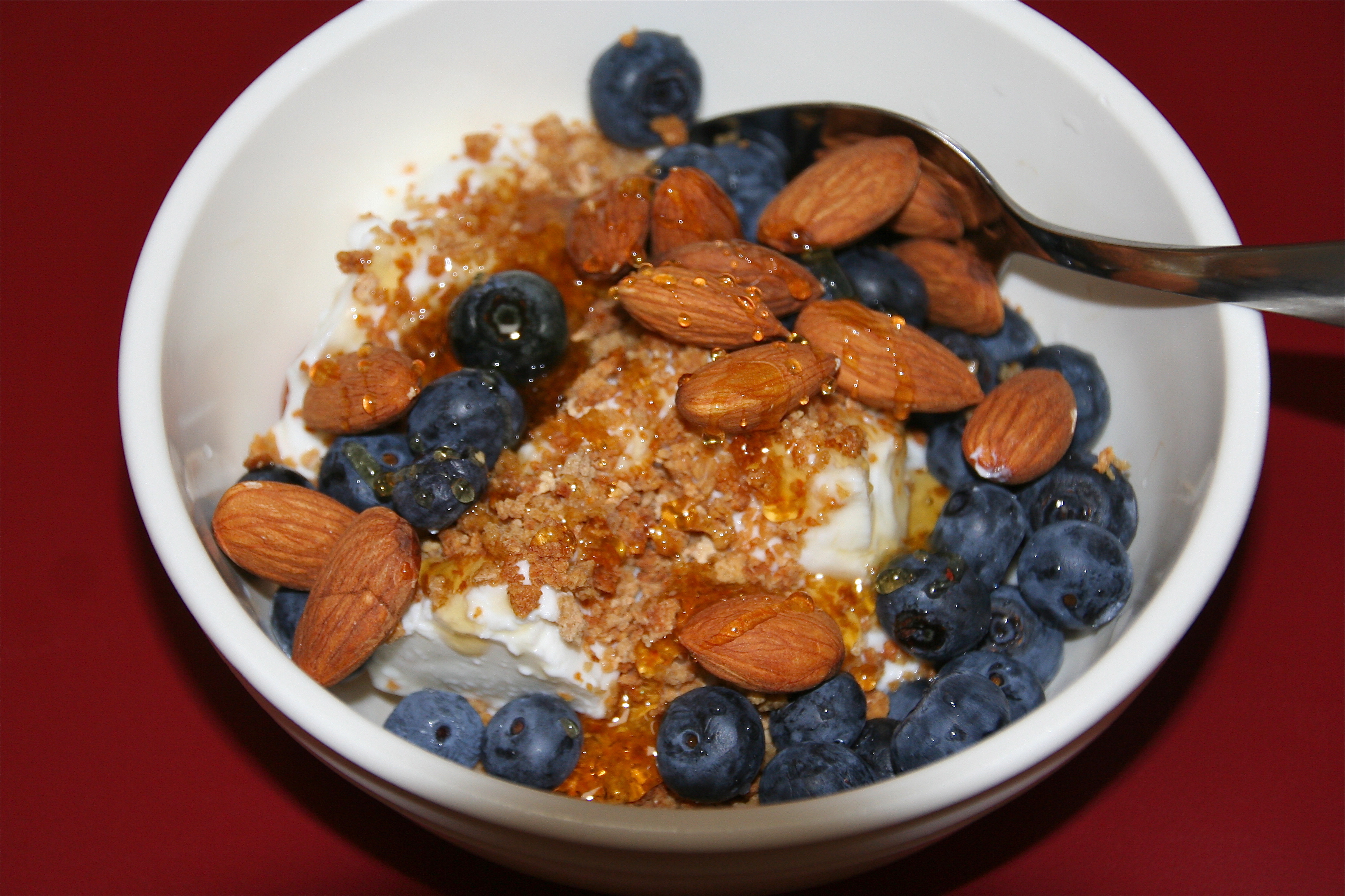 Yes! One of my favorite mixes — plain yogurt, cereal, nuts, berries and a small dip of honey!